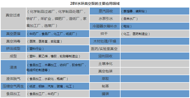 2BV系列水環真空泵適用于抽除氣體和水蒸氣,吸氣壓力可以達到33mbar絕壓(97%真空度)。當水環真空泵在吸氣壓力接近極限真空(工作液的飽和蒸汽壓)下長期工作時,應聯接汽蝕保護管,以對泵進行保護。作為壓縮機用時,其壓力大至0.26MPa(絕壓)。2BV系列水環真空泵作為新一代節能型產品,其以性能及眾多優點將取代同性能的SK、2SK系列水環真空泵及W、WY、WL系列往復真空泵。
