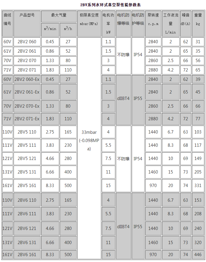 2BV2-Ex、2BV6系列水環式真空泵/壓縮機主要用于抽除爆炸性氣體,及在各類易燃、易爆環境中工作,其性能參數與2BV2、2BV5系列相同。
